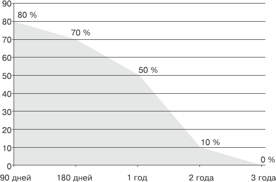 При просрочке долга до одного года, как показывает практика, вероятность взыскать долг падает примерно наполовину. При просрочке долга три года и выше вероятность взыскания долга близка к нулю.