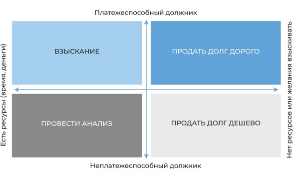 Выбор, с которым сталкивается кредитор: продолжать взыскивать долг или все-таки продать его? Я предлагаю использовать стратегическую матрицу, которая демонстрирует логику принятия решения.