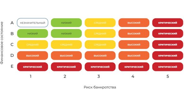 • буквенное (A, B, C, D, E), которое характеризует финансовое состояние организации. При присвоении буквенной части учитывается ряд ковенант, таких как наличие задолженности по налогам, непредставление отчетности более 1 года или представление нулевой отчетности, сумма предъявленных исков и так далее;