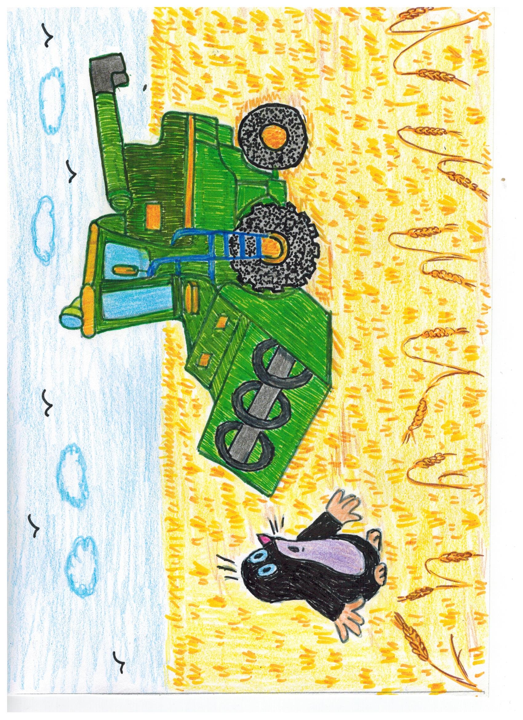 Кротик так любит все новое и интересное, что с радостью согласился. Эмма и Кротик отправились в поле, где работал огромный комбайн. Он занимался уборкой урожая, а именно комбайнированием и измельчением соломы злаковых культур. Эмма рассказала Кротику, что урожай убирается раз в год. Вдруг подъехал огромный грузовик и комбайн начал пересыпать зерно в грузовик, который потом отправился на мельницу. Эмма и Кротик отправились на мельницу, которая находилась на другом конце поля. По пути они прошли мимо комбайна и Кротику удалось его рассмотреть вблизи. Комбайнёр помахал рукой ребятам в знак приветствия и Эмма с Кротиком тоже помахали ему, а ещё они поблагодарили комбайнёра за его трудную и столь важную работу. Когда они пришли на мельницу, Эмма сказала Кротику, что данная мельница ветряная, она работает с помощью ветра. Ветряная мельница имеет лопасти со скошенными краями и когда дует ветер, он скользит о наклонные поверхности и отталкивает их. Лопасти начинают крутиться. И происходит переработка зерна в муку. Также мельницы бывают водяными и электрическими. Из пшеничной муки делают белый хлеб, а из ржаной муки черный хлеб.