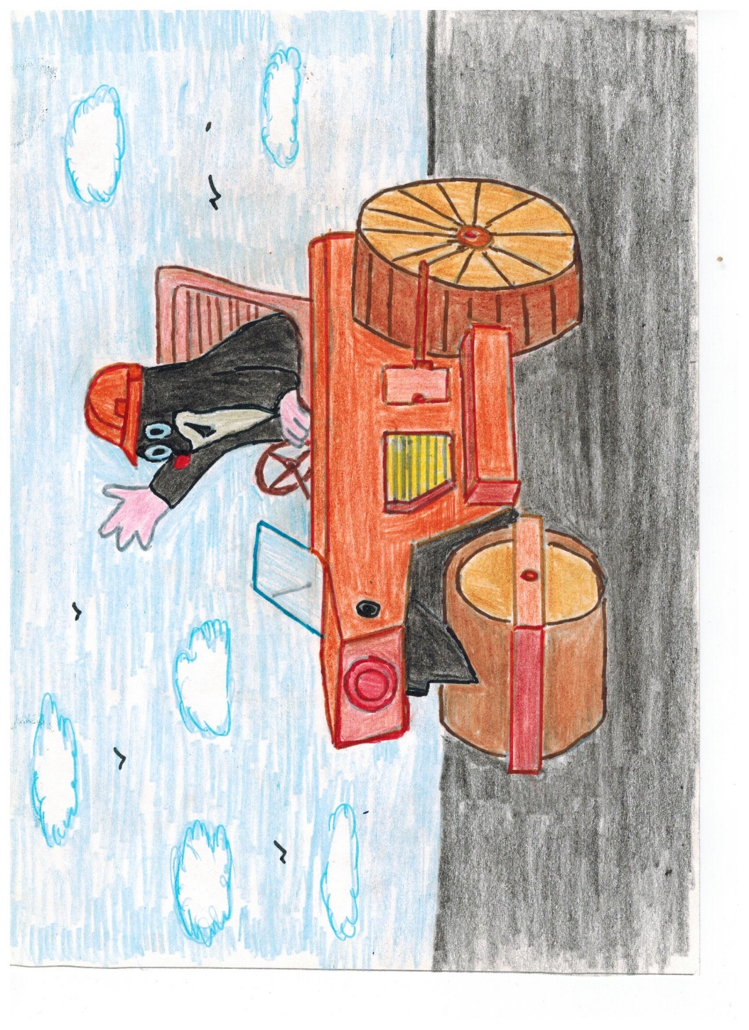 Перебраться через забор Кротику не составило особого труда, он сделал подкоп под забором. С краю стояла строительная бытовка, там рабочие переодевались в специальную одежду, а во время перерыва пили чай, затем стояла длинная очередь строительной техники. Около строительной бытовки было написано Паспорт объекта двухэтажного загородного дома. Шагая вдоль длинной череды строительной техники, взгляд Кротика упал на огромный жёлтый бульдозер. Он был такого же цвета, как его курточка. Кротику так понравился жёлтый бульдозер, что он сразу же позабыл правило «чужое без спроса брать нельзя», забрался в бульдозер и сел на кресло водителя. «Наверно этот бульдозер приготовлен специально для меня, ведь он такого же цвета, как моя курточка» – подумал Кротик. Вдруг он сам не заметил, как повернул рычаг и бульдозер покатился вперёд. Кротик был так напуган, что решил во что бы то ни стало остановить бульдозер, но как же это сделать, ведь управлять такой сложной строительной техникой он ещё не умел. Потянув соседний рычаг, Кротик подумал, что бульдозер остановится, но жёлтый гигант, наверное, решил немного размяться перед сном и поднял свой огромный ковш высоко-высоко. Как Кротик не старался жёлтый бульдозер разошёлся не на шутку и врезался в старую мельницу, которая стояла посреди строительной площадки и разрушил её. Кротик был очень уставшим после длинного дня и после попыток укротить бульдозера. Не совладав со своими силами, он улёгся спать прямо на кресле в бульдозере.