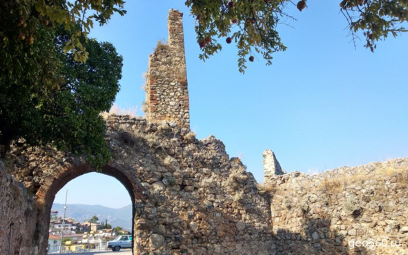 Крепостные стены тянутся вдоль берега на 6,5 км. Сохранилось более десятка башен, крепостных бастионов и несколько ворот. Некоторые входные арки украшены древними письменами. Часть крепостной стены спускается почти к самому морю к Красной башне.