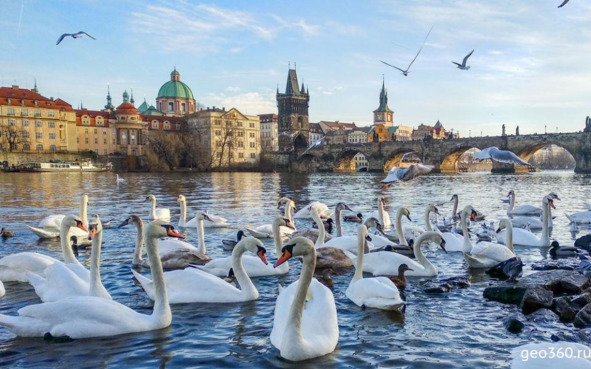 Еще одна замечательная смотровая площадка, на которой можно сделать фото с лебедями на фоне Карлова моста, находится за Музеем Кафки и фонтаном «Писающие мальчики».