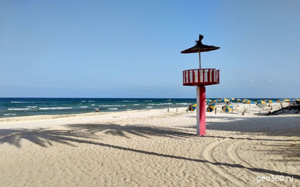 Море в Тунисе чистое, на пляжах мелкий белый песочек. Но по законам этой африканской страны 3 метра от моря принадлежит всем, и поэтому как таковых закрытых пляжей у отелей Туниса нет. Как максимум они огорожены веревочкой по бокам и на расстоянии трех метров от моря, а отельный охранник пытается гонять с них местных тунисцев. Поэтому не рекомендуем брать на пляж с собой документы и аппаратуру, и даже телефоны. Лучше все это оставлять в сейфе. Бывали случаи, что местные вырывали у туристов сумки и телефоны на пляжах, особенно вечером в темноте.