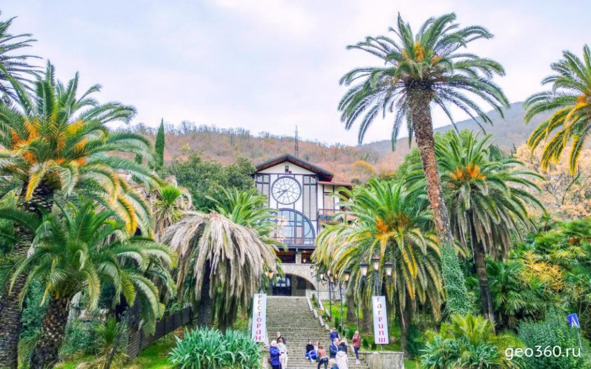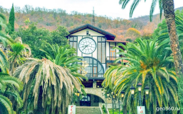 За колоннадой начинается Приморский парк с экзотическими вечнозелеными растениями. В середине парка уже более ста лет стоит красивое здание с часами – ресторан «Гагрипш».