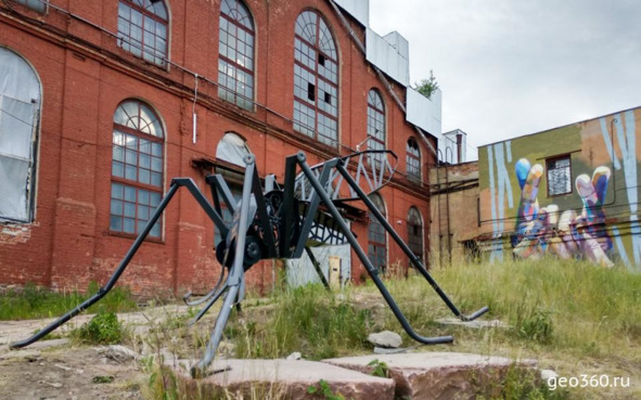 Еще один комар, только поменьше, стоит напротив, у стены сохранившегося исторического цеха Александровского завода. Стены цеха расписаны ярким граффити, ведь здесь находится лофт-проект «Синий кориdoor». Оставшиеся заводские помещения отдали художникам, дизайнерам, фотографам. Здесь разместились ремесленные мастерские, студии танцев, кино и звукозаписи. На Комариной тропе постоянно устраивают выставки и перформансы.