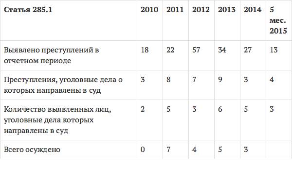 При этом количество уголовных дел, возбужденных по ст. 285.1 УК РФ, остается незначительным, равно как и количество вынесенных приговоров (в 2013 г., например, за совершение данного преступления было осуждено 5 чел.).