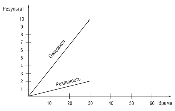 Мы видим героев, которые хотели потратить пять лет на достижение своих целей, а оказалось, что и десяти мало. Мы рисуем две линии: одну, резко идущую вверх (ожидания), а вторую, ползущую недалеко от стартовой отметки (реальность).