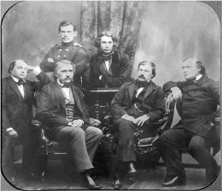 Кружок журнала «Современник». 1856 год. Сидят (слева направо): Иван Гончаров, Иван Тургенев, Александр Дружинин, Александр Островский. Стоят (слева направо): Лев Толстой и Дмитрий Григорович[3]