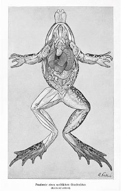 Анатомия самки травяной лягушки. Из книги Альфреда Брема «Жизнь животных». 1911 год. В романе Базаров собирает лягушек для опытов, объясняя дворовому мальчишке: «Мы с тобой те же лягушки, только что на ногах ходим»[9]