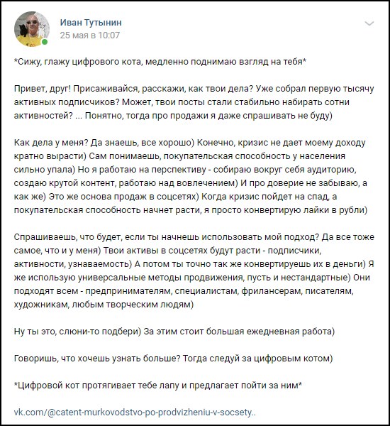 Итак, ты хочешь стать популярным человеком в социальных сетях, собирать сотни мяуков и комментариев под каждым постом, чтобы люди просто читали тебя, а потом писали в личные сообщения – хочу купить твой продукт, куда платить? Но ты не знаешь, с чего начать и что делать, чтобы добиться такого результата. Я правильно тебя понял?