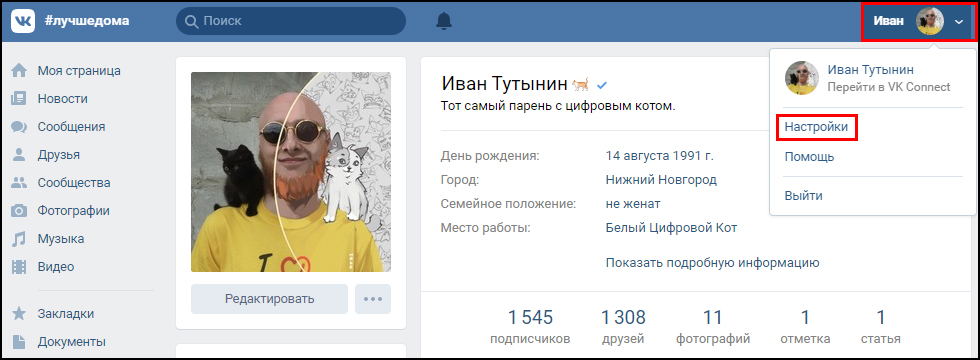 Перейди на свою страницу и в правом верхнем углу зайди в настройки: