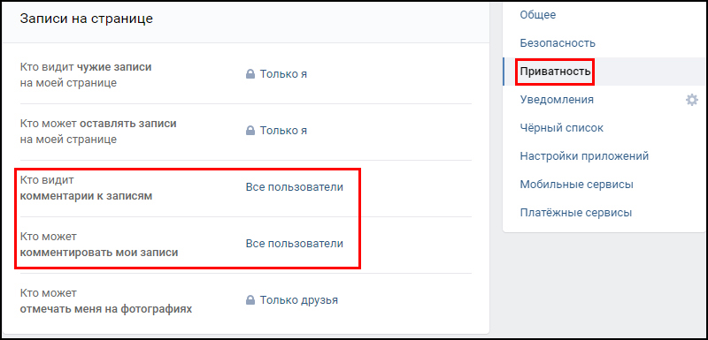 Справа перейди в раздел – приватность. А затем найди и открой для всех пользователей две опции для комментариев на странице: