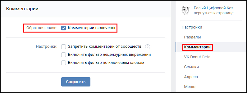 Для сообщества все делается еще проще – переходишь в настройки, справа выбираешь комментарии и включаешь их: