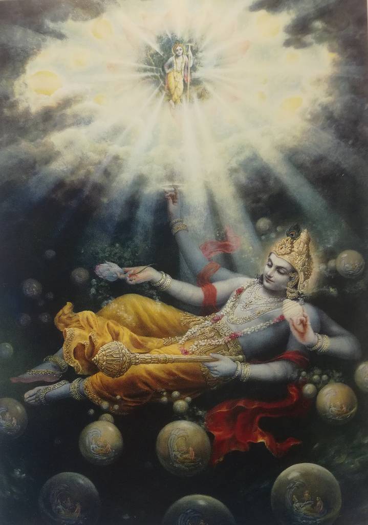 Маха-Вишну возлежит на водах Причинного океана, из пор на коже которого выходят миллионы материальных вселенных(Шримад-Бхагаватам, песнь 1)