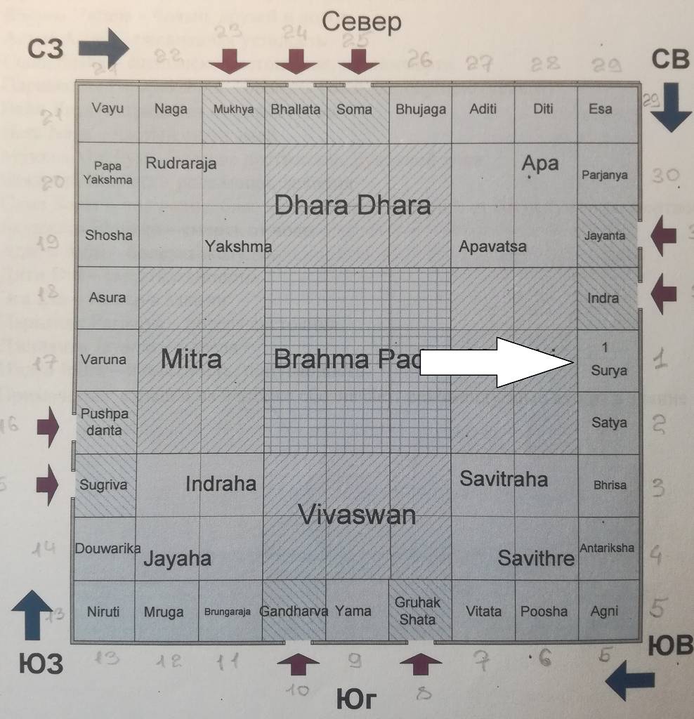 В одной из ведических наук по архитектуре – Васту, Стхапатья веды. С Востока, с Сурья пады(Surya-имя бога Солнца) начинается точка отсчета проектируемого пространства – Ваасту Пуруша Мандалы. Начало идет с Солнца.