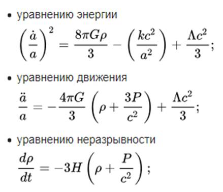 где k – кривизна пространства (принимает значения −1, 0, 1), Λ – космологическая постоянная, ρ – средняя плотность Вселенной, P – среднее давление, с – скорость света, а точка над буквой обозначает взятие производной по времени, например, a=da/dt.