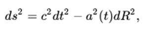 где dR² описывает геометрические свойства пространства модели и является метрикой трёхмерного изотропного и однородного пространства: плоского при k=0, сферического при k=1 и гиперболического при k=−1. В таких системах координат скорость изменения физического расстояния l между двумя точками, покоящимися в сопутствующей системе координат, равна: