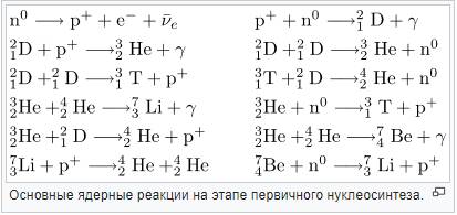 Приблизительно с 100 секунды после Большого Взрыва материя охладилась достаточно для образования стабильных нуклонов, и начался процесс первичного нуклеосинтеза. Он длился до возраста Вселенной 3 минуты, и за это время образовался первичный состав звёздного вещества: около 25 % гелия-4, 1 % дейтерия, следы более тяжёлых элементов до бора, остальное – водород».