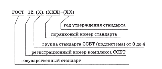 ГОСТ 12.0.001 «ССБТ. Основные положения» устанавливает назначение, структуру и содержание ССБТ, а также построение, содержание и согласование стандартов в этой системе. Структура обозначения государственных стандартов ССБТ состоит из пяти блоков: