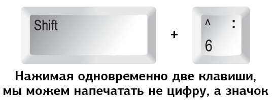 Например, при помощи одной клавиши «6:» можно напечатать и цифру 6, и двоеточие. Для того чтобы напечатать двоеточие, а не цифру, необходимо одновременно с клавишей «6:» нажать клавишу Shift.