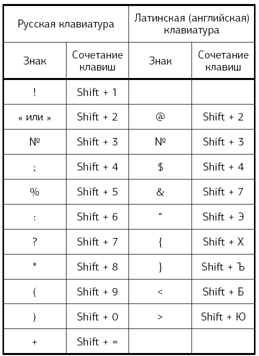 Ниже представлена таблица, которая поможет вам найти нужные комбинации клавиш для печати различных значков.