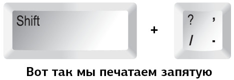 Для того чтобы напечатать запятую в английской раскладке, Shift нажимать не нужно – хватит нажатия на клавишу с бук- вой Б.