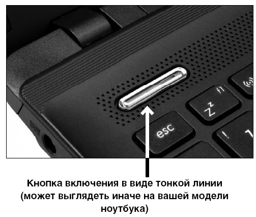 1. Откройте ноутбук. На передней панели, над клавиатурой, слева или справа находится кнопка Индикатор питания (возле нее может быть написано, а может быть и не написано Power, что в переводе с английского означает энергия). Мы о ней говорили выше.