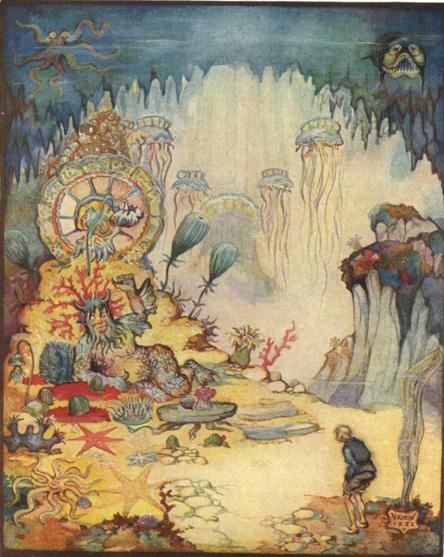 Но это только Палунко думает, что перед ним поляна: не поляна то, а огромный чертог Царя Морского. Вокруг чертога море стоит, словно мраморная стена, а над чертогом море, как свод стеклянный. От камня Алатыря идет сияние голубое, точно прозрачный лунный свет. Висят вдоль чертога ветви жемчужные, высятся столы коралловые.