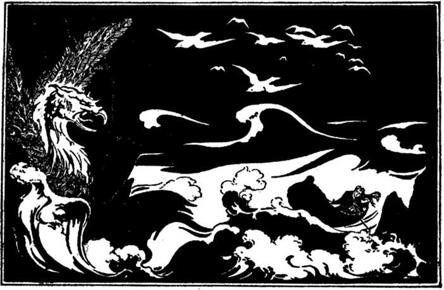 Запомнила все это дочь. На другой день села она в челнок и отправилась в открытое море, не взяв с собой ничего, кроме удочки и свирели двурогой. Носится и скитается она по морю, покамест не принесли ее волны к одному месту, где в море три страшные ущелья из тяжелых туч.