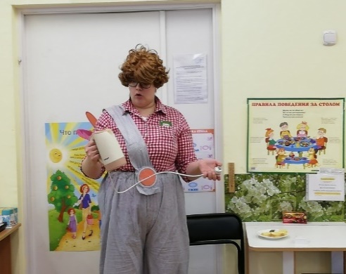 Карлсон берет стакан с водой и пытается попить. Воспитатель останавливает его и говорит, что вода сильно горячая, нужно подождать пока остынет.
