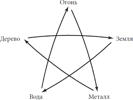 Циклы Чен и K°Цикл Ко, называемый циклом подавления или контроля, позволяет стихиям укрощать друг друга. Термин контроль кажется мне более уместным, поскольку он отражает идею взаимодополняемости, а не превосходства одного элемента над другим. Например, без ограничения Воды Огонь может стать слишком сильным. Мы наблюдаем это в природе: если зима (Вода) слишком мягкая и земля не замерзает, то продукты, выращенные на этой земле летом (Огонь), будут загрязнены микроорганизмами и паразитами, которые должны были погибнуть зимой. Аналогично и у человека при почечной (Вода) недостаточности хуже поддерживаются функции сердца (Огонь), в результате чего начинают проявляться такие симптомы, как бессонница, учащенное сердцебиение, чрезмерное возбуждение. Если Вода в нашем примере правильно контролирует Огонь (в цикле Ко), а последний в достаточной степени питается Деревом (в цикле Чен), то Огонь будет подпитывать Землю и эффективно контролировать Металл.