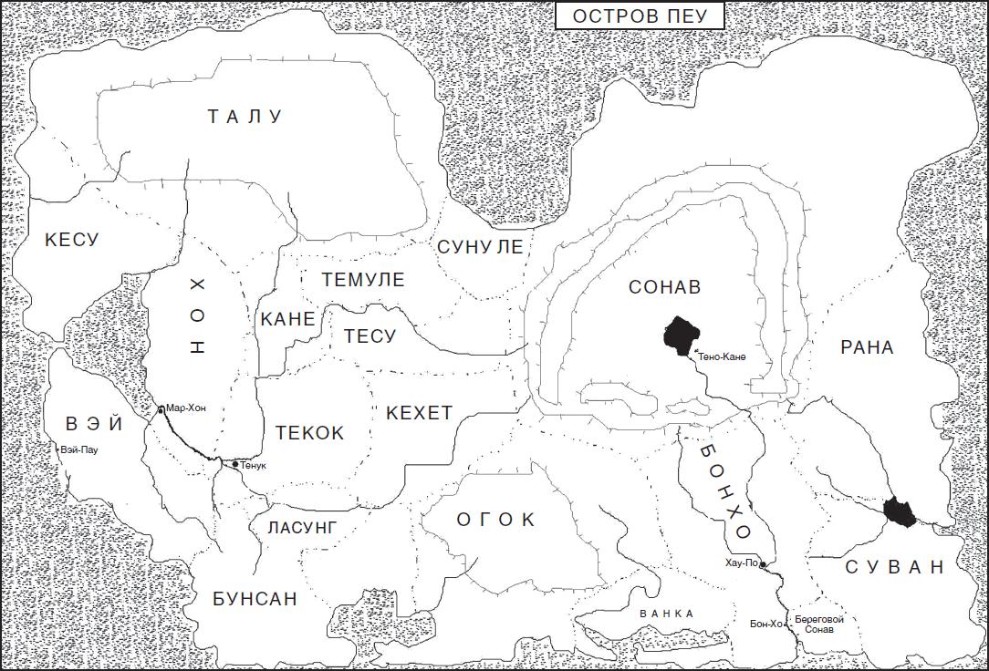 От местных дел мой псевдородственник перешёл к рассказу о своей буйной молодости. Когда ему было «столько дождей, сколько сейчас тебе, Ралинга», дед Темануй отправился на запад Пеу (так, оказывается, называется вся страна, куда меня угораздило попасть) служить некоему Большому вождю, именуемому у сонаев типулу-таки, а у бонхойцев – тиблу-таки. Этот типулу-таки (впрочем, дед, и многие, называл его просто типулу) был в отдалённом родстве с Темануем.