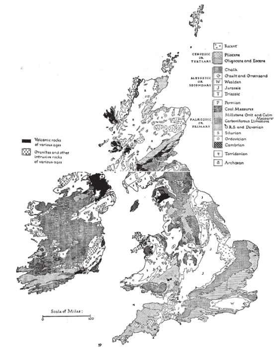 FIG. 1—A simplified Geological map of the British Isles. (Based on Geological Survey)