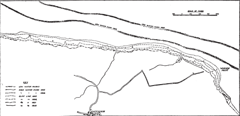 The Isle of Sheppey affords another instance of loss. Between Scrapsgate and the jetty, south-east of Warden Point, along a total length of five and a half miles, the loss of land between 1865 and 1906 was 103 acres, or taking an average for the whole length of the line, an annual loss of 3.8 feet. At Warden Point itself the loss reached 9·7 feet a year on an average. The subsequent evolution of the part near Warden Point is shown in Figure 5.1