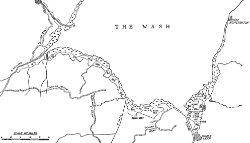 Here and elsewhere accretion on the natural marshes is encouraged by cutting ditches, or grips, running up and down the marsh. A fall of about two feet a mile is given to them, and the excavated material is usually dumped on the seaward side. This helps to produce calm water and foster deposition. If any erosion of the excavated material takes place it is spread over the grassland. The ditches are found to help the ebbing tide and to aid the consolidation of the deposited material before the next tide covers it. They are about 60 or 70 feet apart, and cut when the marshes reach about +10 feet O.D.