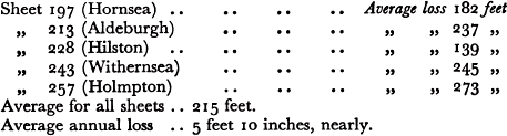 This is but the modern continuation of a long process. In 1895 the British Association for the Advancement of Science appointed a committee to inquire into the rate of coast erosion, which some years later produced the following figures for Holderness. The period covered was 1852–1897, or 37 years, and the figures refer to sheets of the six-inch Ordnance Survey.