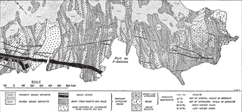 The cliffs reach a maximum height of 150 feet on the western side, and there are clear traces of raised beaches at 50 feet, and probably at 25 feet and 100 feet. Marine erosion has therefore made great use of the lines of weakness in the sill to give it its present features. It is not, however, clear how far the features are the product of present-day conditions of sea level.