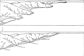 In the early stages, the waves will make the coast more irregular than it was initially, since they are cutting and trimming all the more easily removed parts. In course of time the waves smooth and round off projections and with the material thus produced cut cliffs and build beaches. It is sometimes contended that beaches of various kinds are best developed in the youthful stages of shoreline evolution, and that as time goes on the coast is more and more simplified so that the original great variety of beaches gives way to simplicity or even monotony. Text-books sometimes depict the various stages of evolution as in Fig. 10a, b, c, d. This evolutionary view is broadly correct, but the diagrams are only of general appplication.