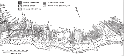 Coast platform showing Sedimentary Structures and Igneous necks between Kinkell Ness and Kingask, Fifeshire. (After S. R. Kirk)