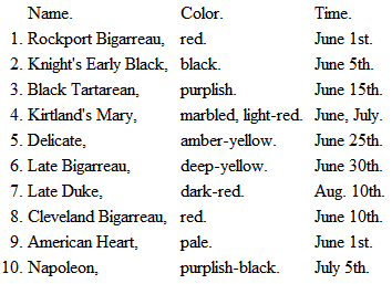 We see no reason for cultivating more than ten or twelve varieties; and, as the above are productive and excellent, including all desirable colors and qualities, and ripening through the whole cherry season, we know not what more would be profitable to the cultivator. If you wish more for the sake of variety, your nurseryman will name them, and show the quality of each, that renders it "the best that ever was," until you will become tired of hearing, and more weary of paying for them.