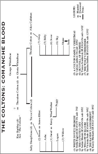 But he didn’t. Jenna could argue against prejudice and bigotry until she was blue in the face, and nothing she said ever made a dent in Carl Elliot’s supreme confidence that the color of his skin—and that of his ancestors—made him superior to anyone who wasn’t as white as the driven snow. Actually, Jenna had given up on trying to change her father’s infuriating intolerance. It cut her deeply that he’d made so much money from those residents of Black Arrow with Comanche blood, yet still looked down on them. As a youngster, she’d been forbidden to play with Indian children and had been sent to a private, all-white school. All the same, she’d had Indian friends growing up. Willow Colton would always be a friend, and Jenna would give her eyeteeth if Bram would relax his guard and become a friend.