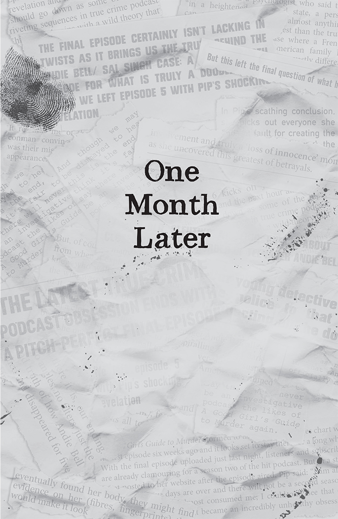 ‘It’s done,’ Pip said, dropping her eyes to the new USB microphone plugged into her computer. ‘I’ve finished. Six episodes. I had to use a noise reduction effect on some of the phone interviews for quality, but it’s done.’