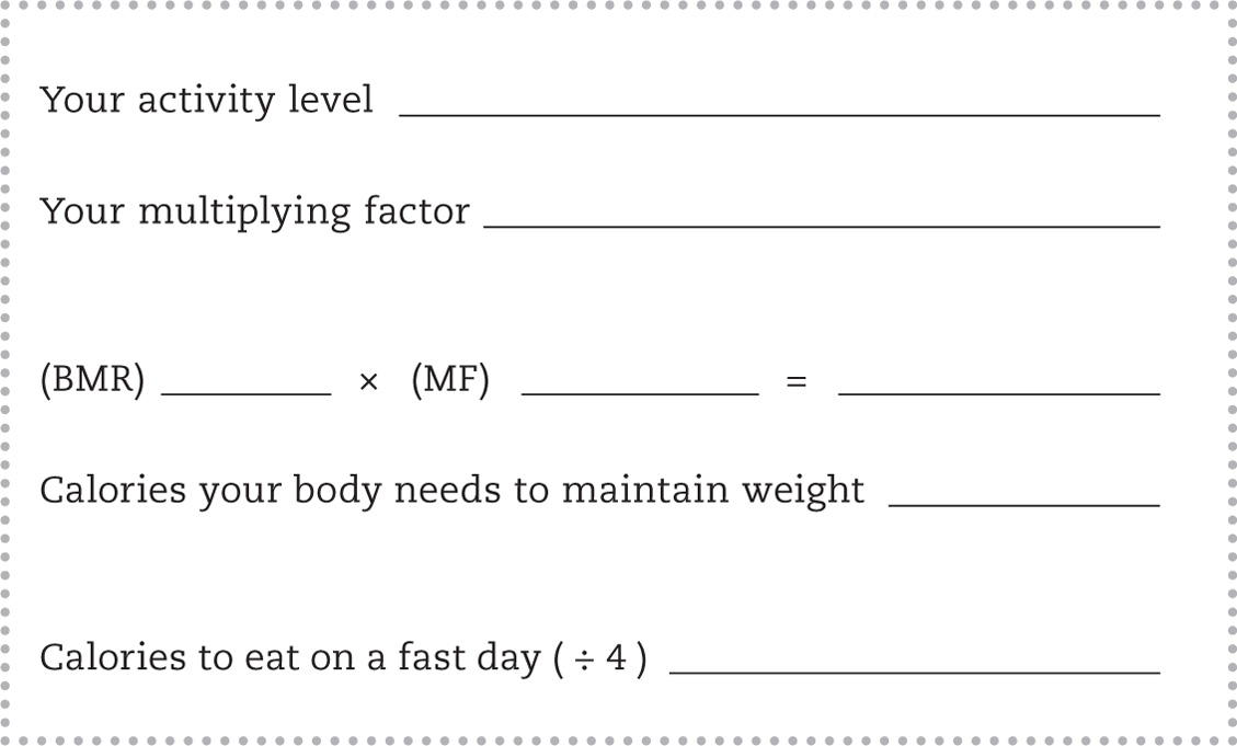 Everybody is different: different weight, different height and different fitness. In this chapter we work out your Body Mass Index (BMI) and metabolic rate (BMR), which is how many calories you burn in a day. By calculating your BMI, we can set suitable and sustainable weight-loss targets. By working out your personal metabolic rate we can set a personalized calorie intake guide for the fast days, and, as we know, every calorie counts on a fast day.
