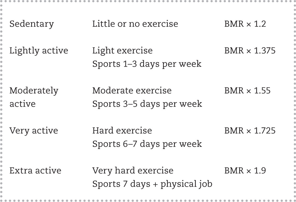 To work out the actual number of calories your body needs to maintain weight, multiply your BMR by the factor in the table above.