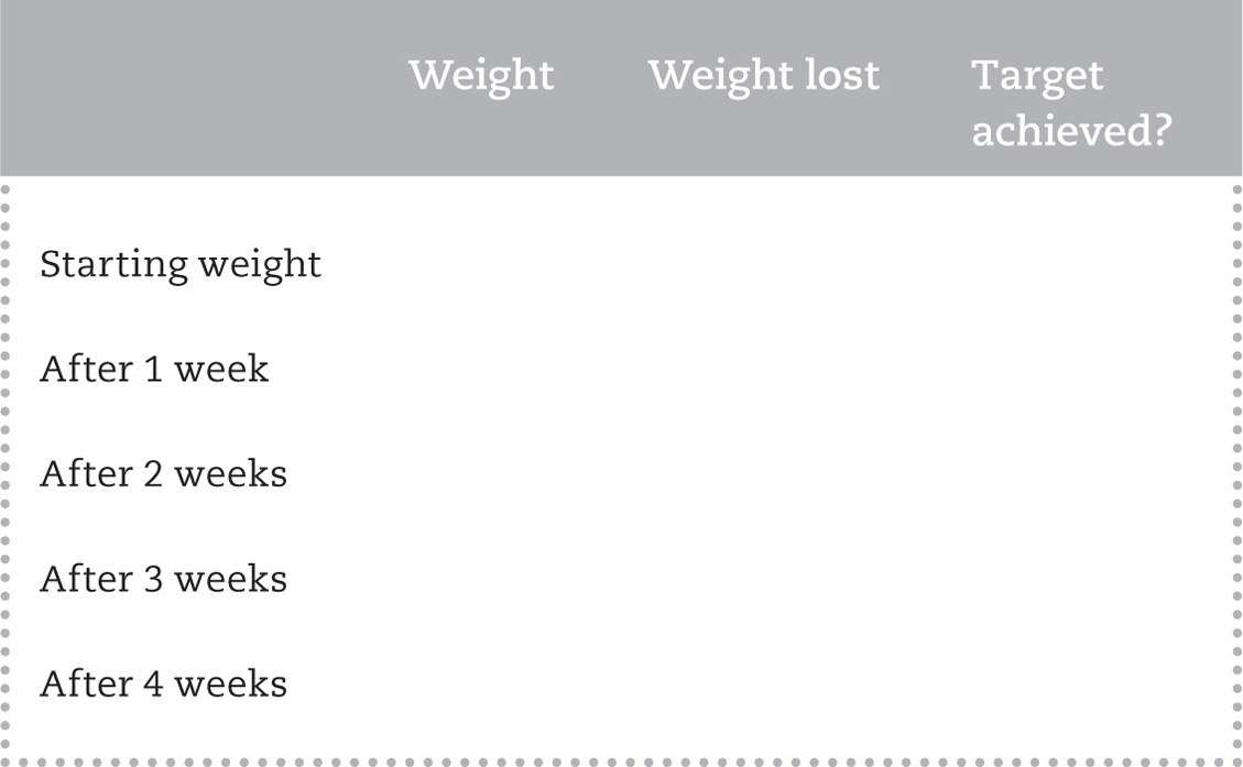The target for your weight loss should be between 1 and 4lb per week. This is not a crash diet and you should only be aiming to lose weight in a safe and sensible way.