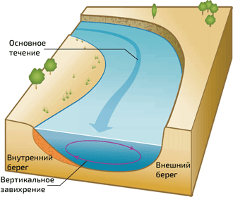 4. Циркуляция воды на изгибе реки по Эйнштейну. Центробежная сила, направленная от внутреннего берега к внешнему, действует в каждой точке жидкости. Но вблизи дна ее действие уменьшается из-за трения, и в основном потоке возникает вертикальная циркуляция. Она захватывает песок с внешнего берега и относит во внутреннюю часть меандра