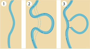5. Изгиб реки, поначалу умеренный (1), постепенно увеличивается, образуя излучину с отложением нанесенного песка на внутреннем берегу (2), а затем приводит к образованию острова или озера в форме подковы (3)