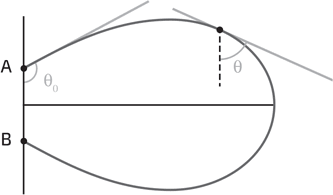 7. Форма, принимаемая упругим стержнем, концы которого зафиксированы в A и B, называется кривой Эйлера. Угол Ѳ между касательной и прямой AB позволяет определить кривизну dѲ/ds, производную от Ѳ относительно пути, пройденного по кривой. Эйлерова кривая минимизирует среднюю квадратичную кривизну стержня, то есть минимизирует интеграл ∫(dѲ/ds)2ds, где Ѳ – угол между касательной и некоторым выбранным направлением, а s – длина вдоль кривой. Интеграл берется вдоль всего стержня