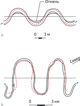 Это заключение согласуется с ранее проведенными лабораторными экспериментами, в которых моделировался процесс эволюции русла реки «в идеальных условиях». Оказалось, что в изначально прямолинейном русле очень быстро образуются меандры, хорошо описываемые кривой Эйлера (илл. 8a). Очевидно, что в природе поведение русла реки существенно сложнее «лабораторного» русла (например, из-за неровной местности). И все же подобные структуры, обычно периодические, возникают естественным образом, когда река течет по равнине (илл. 8b). Как правило, чем шире река, тем больше на ней излучин.